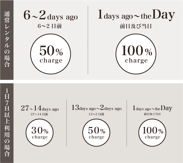 ・ロックアウトまたは1日7時間以上のご予約(同日の別時間帯・複数の予約なども含む)のキャンセル・変更料金は、27日~14日前は30%、13~2日前は50%、前日・当日は100%とさせていただきます。